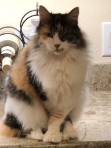 The other one is Poco, a part-Hemingway calico female. She came to us as a tiny kitten of about six weeks old, hence the name “Poco,” Spanish for “little.” She has huge feet, especially the back feet, with six toes on one side and seven toes on the other. Unlike Moxie, Poco is very vocal, greeting you with a little “meow” when you walk in the room. She likes being petted and brushed, especially since she has long, luxurious fur. She also enjoys the twice-a-year haircut to trim her fur back to a more manageable and much cooler level more compatible with Florida heat. Poco was essentially part of a stray litter and as such she has yet to realize that she has hit the “Stray Cat Lottery” ending up in our family. Poco bonded with me, and she is my best little feline friend.